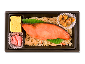 紅鮭は、身の色味や焼き上がりのしっとり感等の自社基準をクリアした原料のみを仕入ております。切身の厚みは職人が一切れ一切れ手作業でカットしているからこその物。冷めても美味しい山形県産の白飯に海苔の老舗である山形屋海苔店の青とび焼海苔、かつお節の老舗であるにんべんの本枯節を使用した自慢の海苔弁当です。